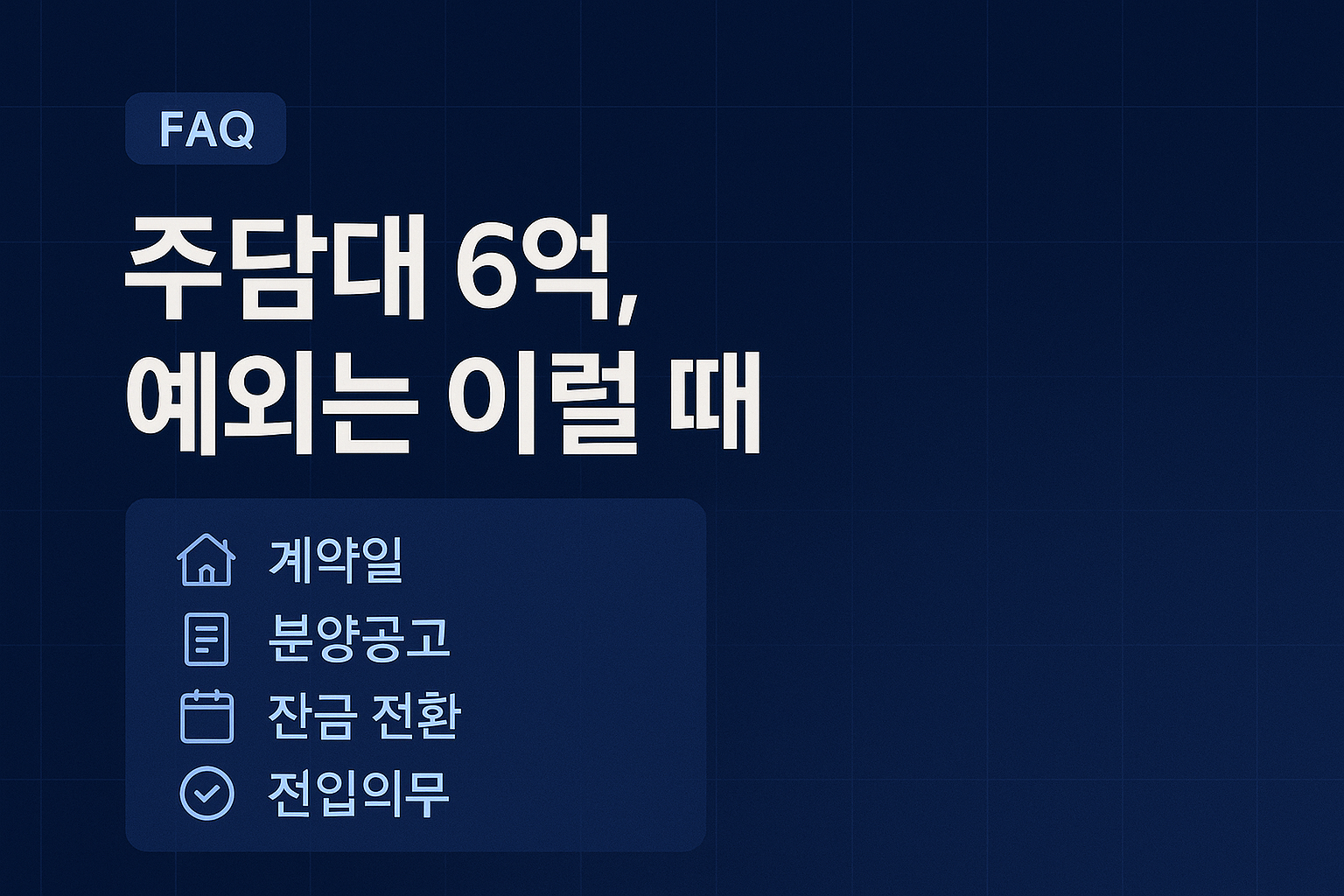 2025-06-28부터 수도권·규제지역 주택 구입 시 주담대 최대 6억원 한도, 전입의무 6개월, 생애최초 LTV 70%가 적용됩니다. 단, 시행 전 계약/공고 등은 경과규정이 있어 예외가 가능합니다. 이 글은 실제 접점(계약일·분양공고·대환/증액)에 맞춘 FAQ입니다.최종 업데이트: 2025-09-08 (KST) 핵심 요약시행일: 2025-06-28(토)부터. 대상은 수도권·규제지역의 주택구입 목적 주담대. 중도금은 제외, 잔금대출 전환 시 6억 한도 적용.경과규정: 시행 전 매매계약 체결+계약금 납부는 종전규정 적용. 분양의 중도금·이주비는 시행 전 입주자모집공고가 된 경우 종전규정 적용.전입의무: 수도권·규제지역에서 주담대로 구입 시 6개월 내 전입(정책대출 포함). 위반 시 회수·향후 제한 가능...